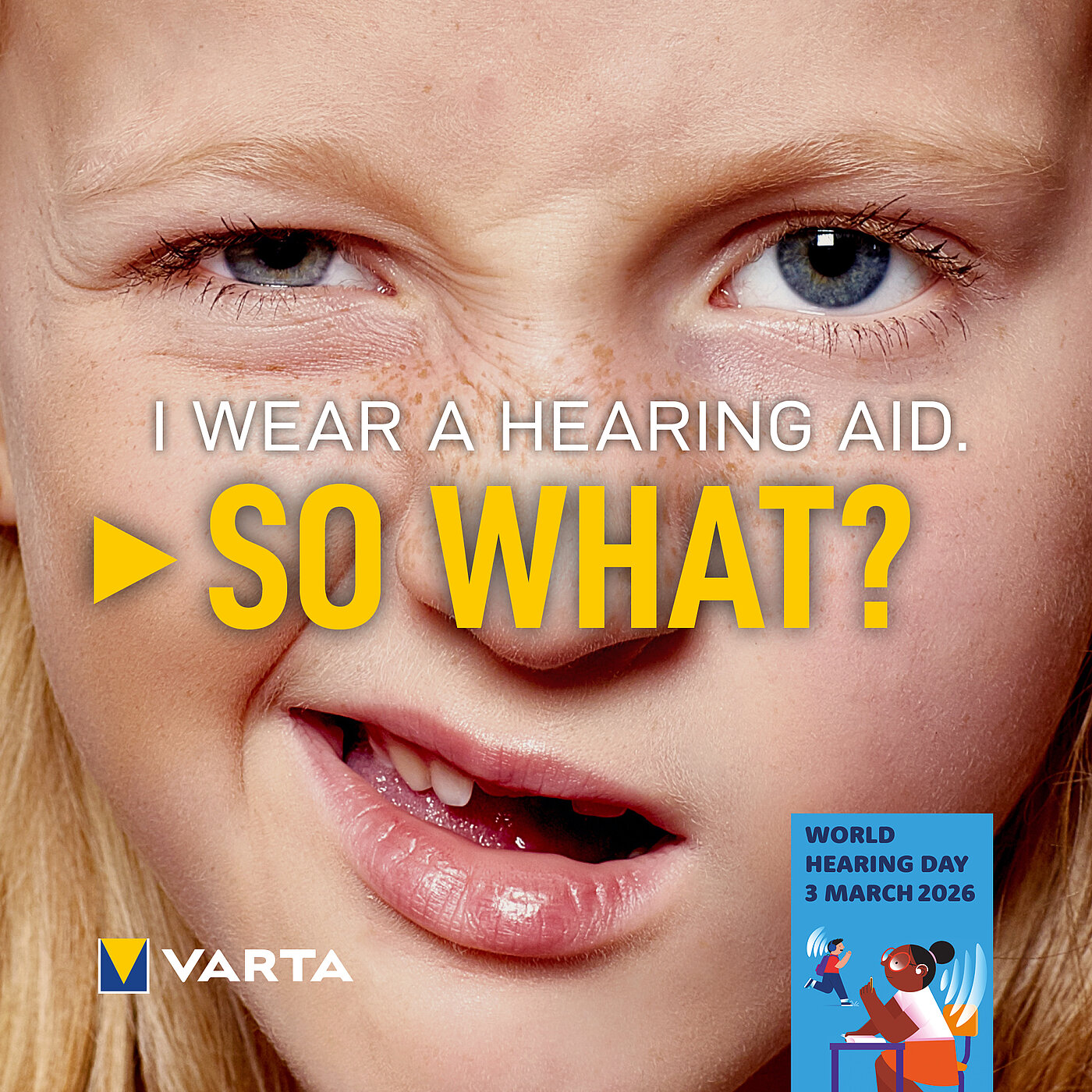 Anlässlich des World Hearing Day am 3. März beteiligt sich VARTA Consumer Batteries mit einer internationalen Kampagne an der weltweiten Initiative für mehr Aufmerksamkeit rund um Ohr- und Hörgesundheit. Unter dem Titel „So what?“ (übersetzt: Na und?) greift die Kampagne das globale Motto der Weltgesundheitsorganisation (WHO) auf und rückt die Bedeutung gesunden Hörens im Kindesalter in den Fokus. Ziel der Kampagne ist es, vermeidbarem Hörverlust bei Kindern vorzubeugen, bestehende Vorurteile und Stigmatisierungen abzubauen. Denn Hörgesundheit ist eine entscheidende Voraussetzung für eine gesunde Entwicklung – wird sie vernachlässigt, kann dies weitreichende Folgen haben.