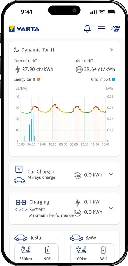 No problem – the VARTA.iq automatically finds a suitable energy source. Even without your own PV system, you can benefit from affordable electricity, as the VARTA.iq optimises with dynamic tariffs and adapts to your energy consumption.