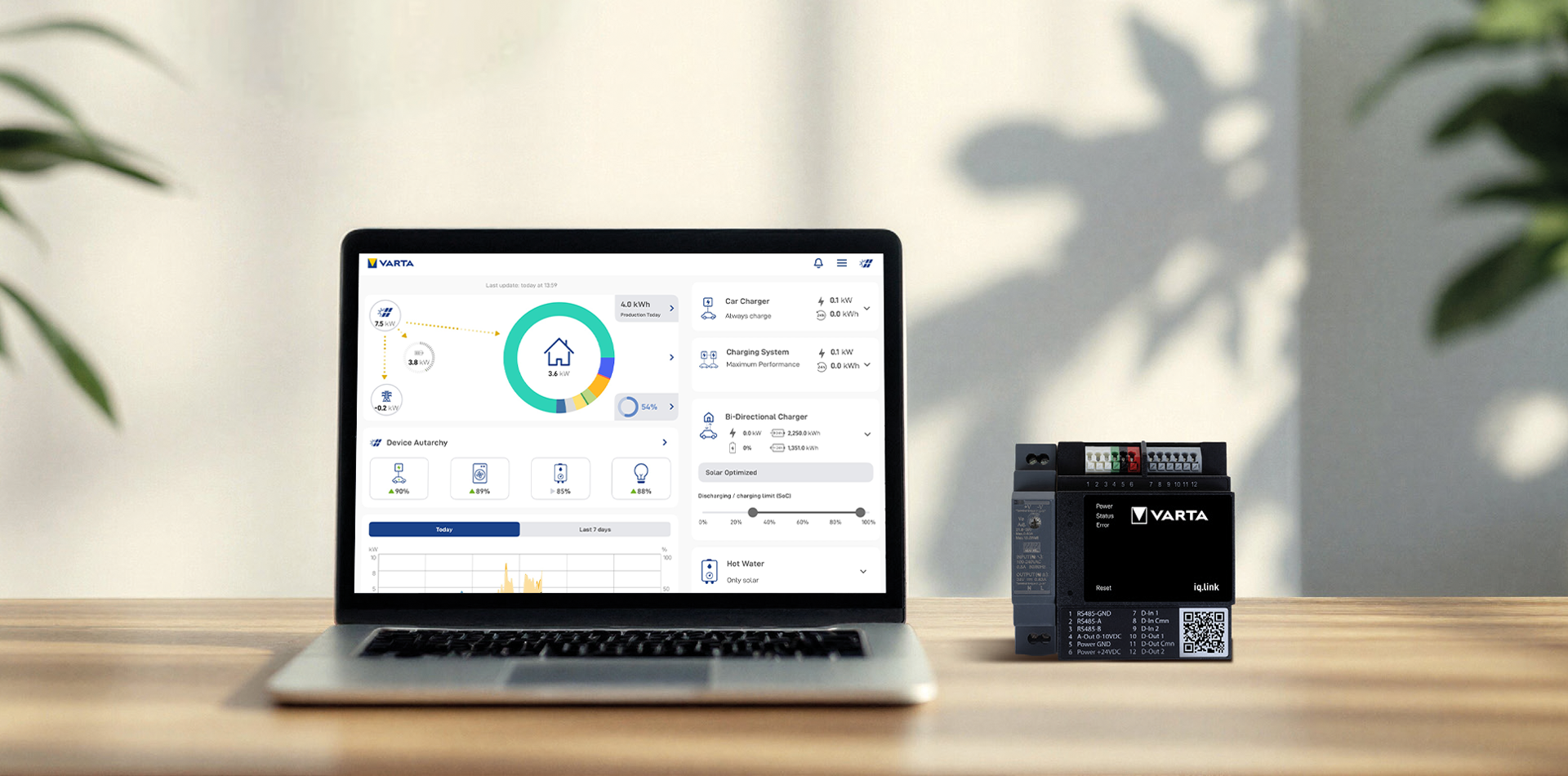 With VARTA.iq, you have full control over your integrated devices. You can determine the power source, timing, duration and amount of energy for charging integrated devices such as heat pumps and wallboxes. The VARTA.iq.link is compatible with over 700 devices in the Pro package and over 300 devices in the Basic package.