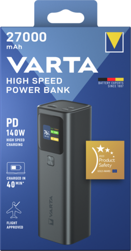 Vă prezentăm cea mai puternică baterie externă VARTA de până acum! Bateria externă VARTA High Speed cu o capacitate de 27.000 mAh poate alimenta până la 3 dispozitive, precum smartphone-uri, tablete și chiar laptopuri, timp de câteva zile! Cu o putere de 140 W, poate încărca un MacBook Pro 16 până la 50% în doar 40 de minute!*. Păstrați controlul cu ajutorul afișajului digital inteligent care vă arată puterea de ieșire în timp real, nivelul bateriei și starea temperaturii. Powerbank-ul este compact, ușor, aprobat pentru zbor și perfect potrivit pentru toate călătoriile dvs. Bucurați-vă de performanță maximă, design și siguranță VARTA premiată. *Mac Book Pro 16. Performanța poate varia.