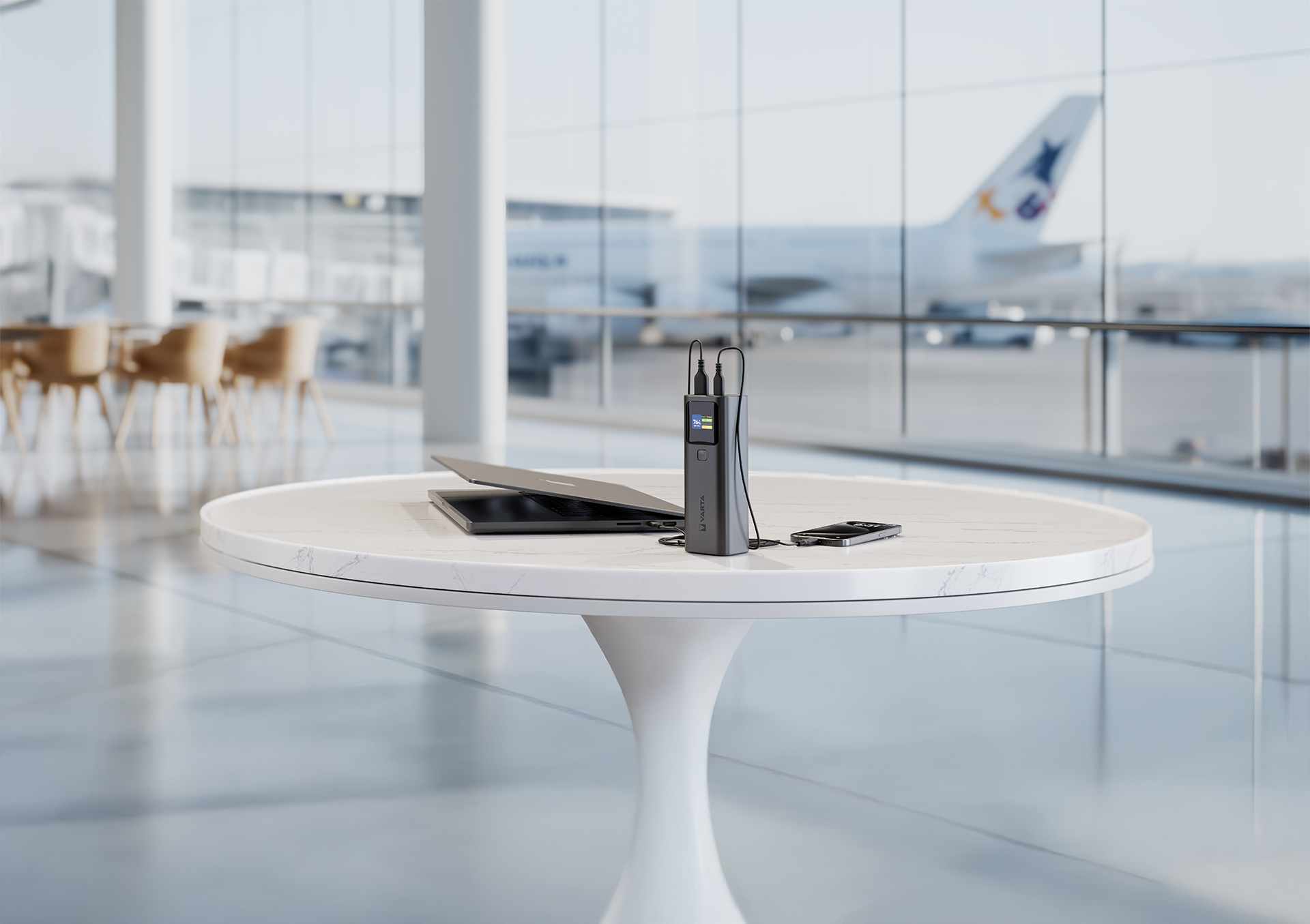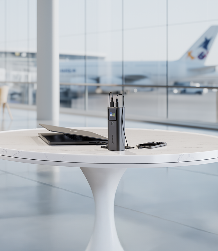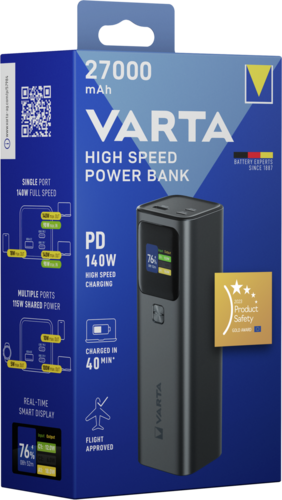 Meet our most powerful VARTA Powerbank ever! The VARTA High Speed Powerbank with 27.000 mAh capacity keeps up to 3 devices like smartphones, tablets, and even laptops powered up for days! With 140W power output it charges a MacBook Pro 16 to 50% in only 40 minutes!*. Stay in control with the smart digital display showing you the real-time power output, battery level, and temperature status. The Powerbank is compact, light & flight approved and perfectly suited for all your travels. Enjoy maximum performance, design & awarded VARTA Safety.